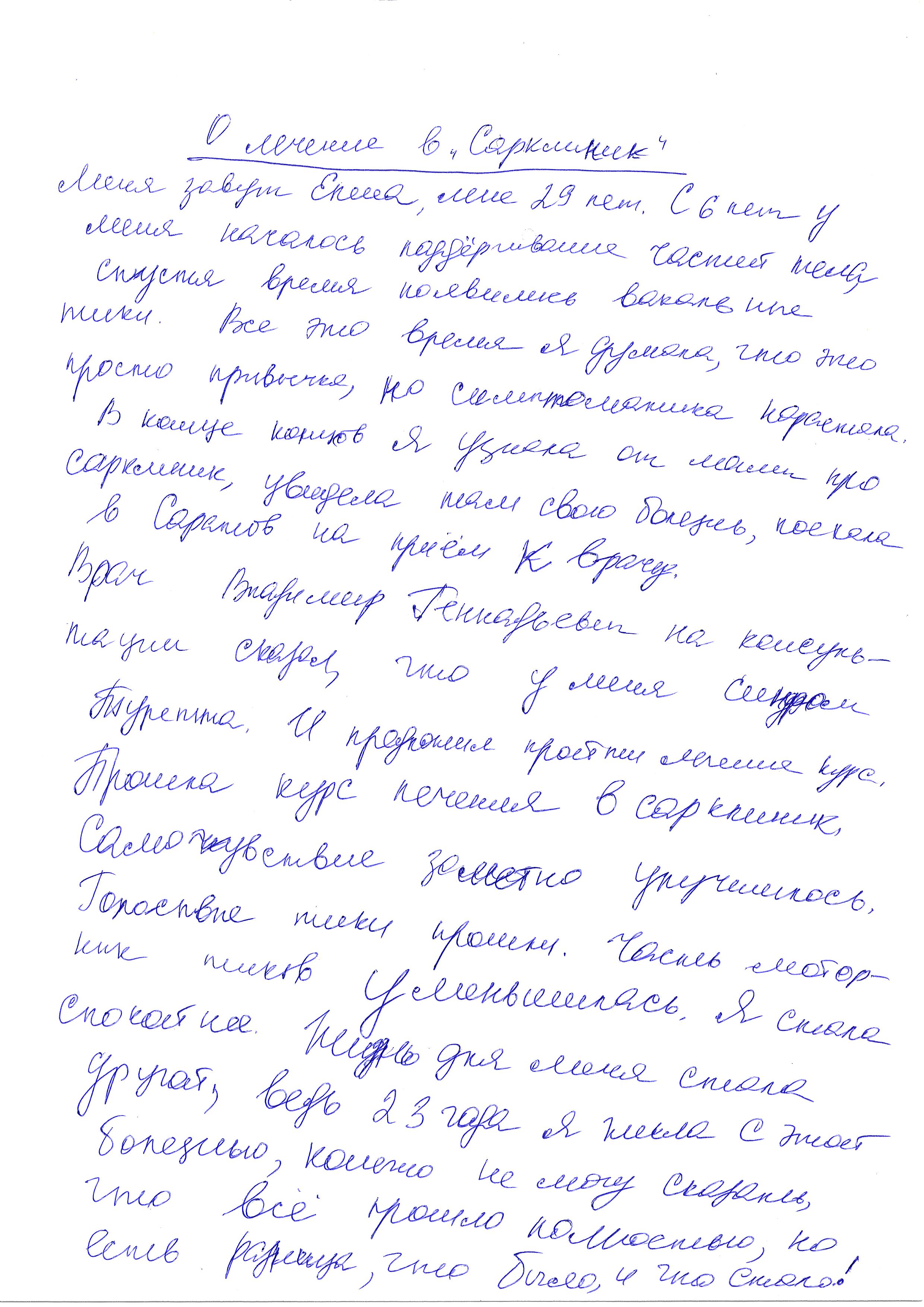 Врач Владимир Геннадьевич на консультации сказал, что у меня синдром Туретта. И предложил пройти лечения курс. Прошла курс лечения в Сарклиник. Самочувствие заметно улучшилось. Голосовые тики прошли. Часть моторных тиков уменьшилась. Я стала спокойнее. Жизнь для меня стала другой, ведь 23 года я жила с этой болезнью, конечно не могу сказать, что все прошло полностью, но есть разница, что было и что стало!